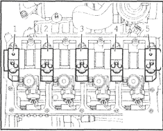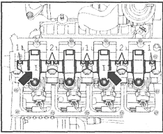 11 Установите коленчатый вал так, чтобы кулачки, соответствующие цилиндру №1, должны быть обращены вверх (см. сопр. иллюстрацию).